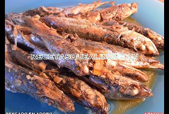INGREDIENTES1 kilo de jureles, media cabeza de ajos, una cucharadita de pimentón dulce, medio vaso de aceite de oliva, una cucharada sopera de vinagre, perejil, tomillo, orégano, cominos, agua, sal.PREPARACIÓNLimpiamos el pescado, eliminando escamas y vísceras, lavamos y escurrimos. Si los jureles son grandes los cortamos en rodajas, en este caso no ha sido necesario. Se puede utilizar esta receta para cualquier especie de pescado azul.