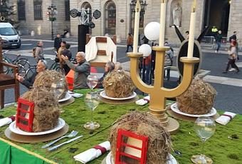 Este año, en medio de la plaza se ha plantado la mesa de una comida navideña en familia. Se trata de un montaje del escenógrafo Sebastià Brosa en el que cada uno de los asientos representa a los personajes más célebres del pesebre. Una trona más alta que el resto de sillas, con un babero con el nombre de Jesús, preside este belén. La mesa está preparada con copas, candelabros, cubiertos, platos y sillas vacías.
