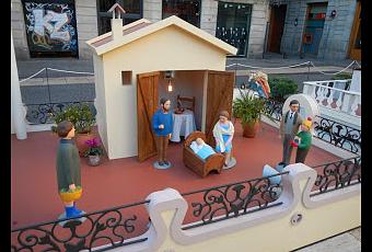 Los huertos del pesebre clásico son sustituidos por los huertos urbanos de hoy, los pastores convertidos en vecinos que preparan una barbacoa, el gallinero de antes es ahora un palomar donde las gallinas comparten espacio con las palomas, la mujer que antes lavaba en el río ahora lo hace en el lavadero mientras observa al niño que juega con una cometa que se convierte en la estrella de Navidad.