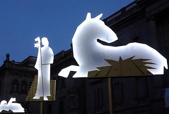 El pesebre del Ayuntamiento de Barcelona, en la plaza de Sant Jaume, es una de la tradiciones navideñas de la ciudad Condal. Este año, el pesebre ha sido diseñado por el arquitecto Jordi Dauder y está formado por 25 figuras de metacrilato que ilustran el nacimiento y otras escenas –entre ellas San José, la Virgen, el Niño Jesús, los tres Reyes Magos y el 'caganer'– .