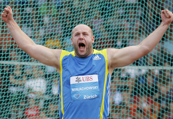 El de los brazos abiertos es el polaco Piotr Malachowski, tal vez el mejor lanzador de disco de la actualidad y ganador de la Diamond Race (DR) 2010. Aún no tiene títulos grandes; sus mayores logros son nada más ni nada menos que dos medallas de plata en Beijing 08 y en Berlín 09. Está pasando por un período de lesiones, pero de a poco y con cirugías, el dolor va cediendo y aparece el mejor Malachowski. La mejor marca de su vida fue de 69.83m., algo lejos del record pero puede mejorar bastante. Es favorito de cara al 2011.