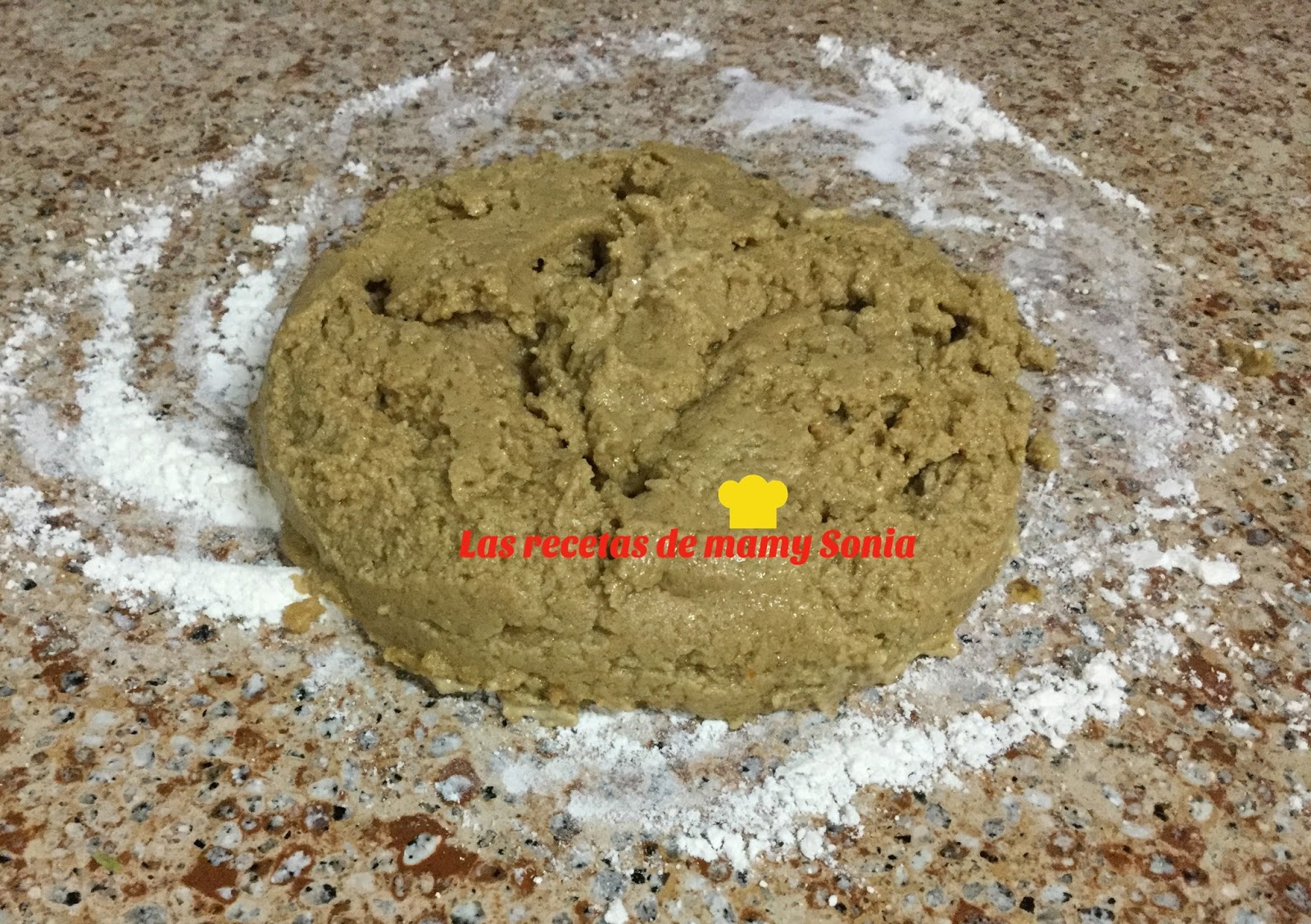 Incorporamos la harina y amasamos, vertemos sobre la encimera, Trabajamosla masa hasta que nos quede una bola compacta que no se nos pegue a las manos.
