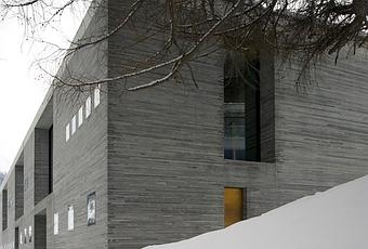 Los pesados muros de piedra soportan las losas de cubierta con naturalidad. Están ejecutados entre el hormigón y la piedra de manera alternada. Los paramentos que dan al interior de la montaña son de hormigón; cuando se liberan hacia la ladera son ejecutados en piedra extraída del lugar, tallada en piezas alargadas que siguen las vetas de la roca, en proporciones que semejan los tablones de madera de diferentes grosores.