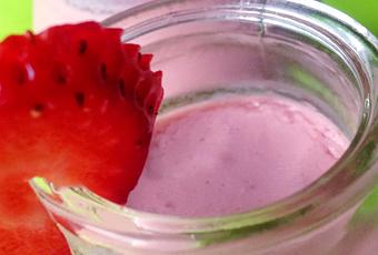 Lavamos y troceamos las fresas, les añadimos el azúcar y lo dejamos estar un rato para que las fresas suelten su propio azúcar. Añadimos la leche de coco, batimos y llevamos al fuego. Incorporamos el agar agar y dejamos hervir 2 minutos, ni más ni menos.
