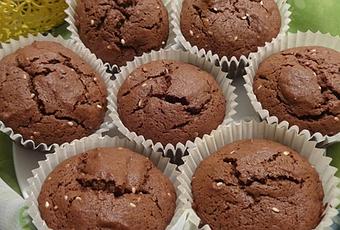 Ingredientes:80 g de harina común, 50 ml de aceite de canola, 1 huevo, 50 g de azúcar en polvo, 15 ml de leche, 1 cucharadita de polvo de hornear, 40 g de chocolate negro, 1 ½ cucharadita de cacao sin azúcar, 2 cucharaditas de semillas de sésamo.