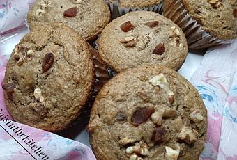 4- Add the dried apricots and mix gently. Using an ice cream scoop, divide the batter between the muffins cases. Add a few pieces of walnut on top. Bake the muffins for 25-30 minutes.