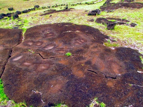 Petroglifos en el volcán Ranu Kau y en la aldea ceremonial de Orongo. En estos lugares se tienen numerosos petroglifos con una temática diferente. Son, en su mayoría, relacionados con el culto al dios Make Make y a la competencia del Tangata manu u hombre pájaro.