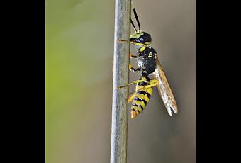 "Pequeña avispa, de 12 a 18 mm de longitud, distribuida por el norte de África y Europa. La hembra es predadora de la abeja melífera europea a la que captura paralizándola con su veneno. Luego la encierra en una cámara subterránea y realiza la puesta en el interior de la abeja, de la que se irán alimentando las larvas durante su desarrollo. Por este compartimiento parásito recibe el nombre común de lobo de las abejas."