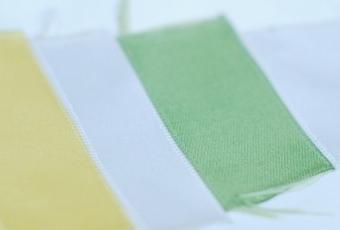 En primer lugar elegimos los colores. La paleta estaba basada en un amarillo pastel y un verde lima, que combinamos con blanco. Lo primero que hicimos fue elegir lazos de estos colores en diferentes anchos y crear una secuencia que pegamos en un papel como guía.