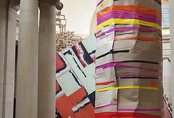 Los materiales de las piezas son baratos y reutilizables, como es habitual en su producción. Sus diseños en madera, metal, poliestireno, lienzo o cuerda ofrecen un interesante contraste con la arquitectura neoclásica de la Tate Britain.