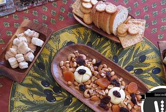 Almendras, nueces, castañas de cajú y maní (todos tostados pero sin sal) + dátiles y pasas + quesitos franceses + tomates cherry + aceitunas + "salteñitas" (mini galletitas pan) + papitas noisette provenzal (hechas al horno y sin aceite) + pan de maíz y galletitas de cereales + pesto + mayo con morrón y mayo con ajo.
