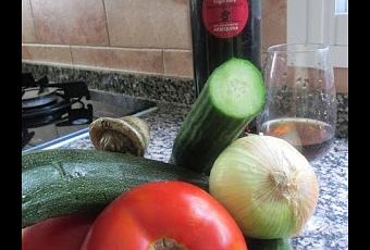 - Tomates rojos y prietos ½ kg.- Pimientos verdes 1 grande.- Cebollas 1.- Calabacines 1 grande.- Pepinos 1 grande.- Aceite de oliva 10 cucharadas soperas.- Vinagre de Jerez o Montilla 4 cucharadas.- Sal.- Cubitos de hielo.