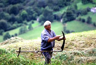 Durante los veranos una de las labores más importantes que se realizaba en casi todas las casas de los pueblos era "ir a la hierba".Había que segar los prados cuando la hierba estaba alta y madura para luego dejar trabajar al "mejor obrero" que se decía era el sol. Antes de segar, es necesario picar el dalle,que consiste en golpear con el martillo todo el perfil de la hoja, apoyada sobre el yunque,para así machacar todas las irregularidades que se hacen en la hoja al golpear ésta con las piedras.Se hace tumbado en el suelo, generalmente sobre un saco.Picar el dalle es necesario para facilitar el afilado de la hoja a la hora de dar piedra. La colodra o gachapa es el utensilio donde se guarda la piedra y que contiene agua para ayudar al afilado del dalle durante el trabajo. Una vez cortada la hierba, cuando está curada, es decir seca, se atropa en hacinas si hay riesgo de lluvia ,se reúne la hierba en morujas;cada diez o veinte morujas se hacía una montona (San Sebastián de Garabandal).Estas montonas se cargaban en los carros, a razón de una por carro. En estas labores participaban chicos y grandes y algunas veces se hacían colectivamente entre vecinos. Una peculiaridad de algunos pueblos de la Cuenca del Nansa como Tudanca,Sarceda o La Lastra era la explotación de prados propiedad de todos los vecinos,los llamados "praos-concejo".Siempre son magníficas praderías situadas a gran altura y su siega iba precedida, cada año,del reparto de las suertes o porciones que le tocaban a cada vecino La fecha de inicio siempre suponía una fiesta en la cual todo el pueblo subía al "prau" donde comenzaba de forma simultánea la siega de todas las parcelas.Después había que bajar por aquellas cuestas tan pindias la carga de hierba con las basnas,que son una especie de trineo, arrastradas por vacas. En otras zonas se utilizaban el corzo o la narria En campoo están los "prados del toro" en los que la siega de estos se hace entre todos los vecinos, y la hierba es exclusivamente para el toro semental del pueblo Con las parejas uncidas a los carros había que acarrear la hierba hasta el pajar en aquellos carros llamados chillón o chirrión.Para que no perder la preciada carga, los carros "se trezaban" esto es, se atada la hierba con una cuerda pasándola por los pinos del carro.Tenían que prepararse para llevar esta carga que era más voluminosa que pesada, por lo que se le añadia la rabera o angana en la parte de atrás y la gavia, horca o delantera, en el frente "Ir a hierba" coincidía siempre con largas y calurosas jornadas durante el verano .Era necesarias decenas de carros de hierba seca para llenar el pajar y con ellos alimentar al ganado durante el invierno.En su interior se pisabala hierba para que entrara cuanta más, y en muchas ocasiones la chavalería se ocupaba de esta labor,suponiendo casi siempre momentos ,primero de júbilo y más tarde de agotamiento Todavía no hace mucho, en la comarca de Pas el sistema de explotación ganadera consistía de forma generalizada en el uso de sucesivos invernales, a medida que en éstos se fuera acabando el pasto.La desaparecida raza de vaca pasiega proporcionaba una excelente leche con la que han elaborado quesos,mantequilla y sus ricos postres: los sobaos y las quesadas pasiegas. Hoy se explotan las vacas holandesas que, además de proporcionar abundante leche,premiten criar ganado para ser vendido.El ganadopermanece generalmente encerrado en las cabañas, donde también vive junto a la familia. A diario se siega verde que se transporta sobre la espalda en belortos hasta la cuadra. Agotada la hierba, el pasiego inicia la muda con su familia, sus enseres y el ganado y se dirige hasta su siguiente invernal. Para transportar sus enseres cuenta, generalmente, con el caballo además de sus característicos cuévanos.Los pasiegos hacen uso de varias de estas caballanas y a veces se "mudan" de quince a veinte veces al año. Esta transhumancia que coincide con las épocas más fértiles de su tierra les lleva a vivir en verano en cabañas llamadas "branizas" y que son las que están situadas a mayor altura, y en invierno en las cabañas "vividoras", que se sitúan cerca de los núcleos de población y son las que durante todo el año albergan a los ancianos y niños El prototipo de la vaca cántabra es la tudanca con sus enormes cuernos y sus "orejas".(círculos blancos que rodean sus ojos).Otras razas derivadas de ésta son la campurriana,muy corpulenta y tonalidad "sarda", y la lebaniega, más menuda y de color rojizo.Otra raza, ya desaparecida,es la pasiega, con la parte trasera muy desarrollada y de un color rojo intenso.En las comarcas guriezanas se conserva la raza llamada"monchina" Rojiza con mucho pelo destaca por su bravura. Hubo una época en la que sus toros se utilizaron como reses de lidia en las corridas de toros locales. "....Las tudancas, comenzada la primavera,suben a los puertos agrupadas en cabañas,cada una con sus correspondientes vaqueros,sarrujanes y perros. Son las que antaño arrastraban carretas y basnas por difícilesn caminos y recuestos.Son, tambien las mismas que zurriendo el ronco campano acudian a las tradicionales ferias del año,con el noble fin de ser vendidas para que, con el dinero pudieran o, simplemente, comprar un poco de aceite,alubias o vino Tanto en Campoo como en Liébana se siembra trigo y en el resto de Cantabria se ha ido sustituyendo por maíz. de las legumbres,la principal es la alubia además de las nabas y arvejas(guisantes).La forma tradicional de cultivar las alubias es plantándolas entre la maíz, para que sus tallos puedan trepar sobre los del maíz.Aún se cultiva muy modestamente el garbanzo en Liébana y campoo.Por otro lado, en Vaderrediblen la patata tiene una notable importancia como merecida es su fama El cultivo de la vid sólo persiste en el Valle de Liébana,elaborándose una especie de jerez llamado Tostadillo así como el orujo de Liébana, para el que se utiliza la técnica de