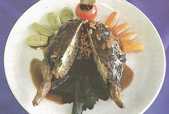 Se sirven acompañados con la mezcla de arroz que nos ha sobrado del relleno, unas zanahorias y patatas torneadas y cocidas y la salsa por encima.