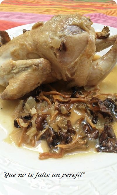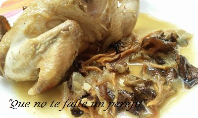 Incorpora los picantones. Pon el laurel, el caldo de ave y el agua previamente colada de hidratar las setas.