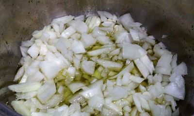 Cuela el aceite. Vuelve a poner de ese mismo aceite la cantidad suficiente para dorar la cebolla picada y los dientes de ajo laminados.