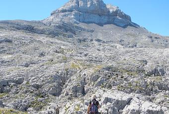 Karst de LarraSalimos del karst y el paisaje se abre. Tenemos antes nosotros el grandioso pico Anie y nos sorprende un grupo de rebecos que salen disparados ante nuestra presencia. Continuamos avanzando hasta situarnos en la base de la pirámide.