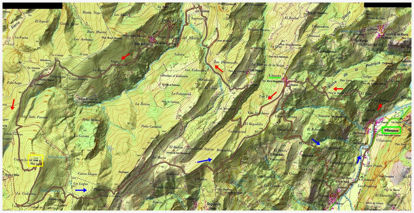 Itinerario: Villanueva (Sto. Adriano)-Vega Caúzu-Linares-Campa las Veigas-El Ortigal-La Condesa-Santo Andrés del Monte-La Collada-Collada Fancuaya-Loral (1248 m)-Vega Cuevallagar-Cantu la Flecha-Alto la Cruz de Linares-Linares-El Dentín-Proaza-Villanueva