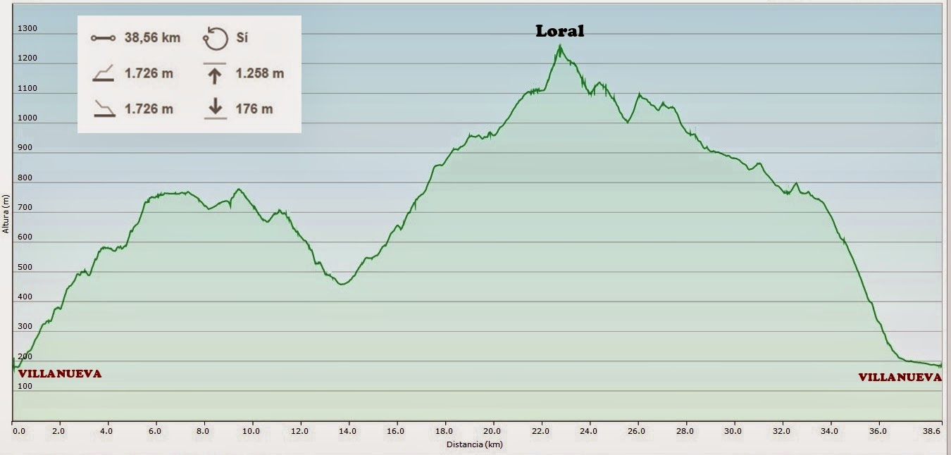 Perfil de la ruta (38, 6 km). Track: http://es.wikiloc.com/wikiloc/view.do?id=7819540