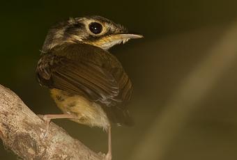 La mancha loral, la barbilla y la garganta son blancas; tiene una franja negruzca a cada lado del cuello; el pecho, el costado y los flancos son de color blanco acanelado que se torna amarillo pálido en el resto del vientre. El pico es ancho, plano y es negro, excepto en la punta y los bordes de la mandíbula.