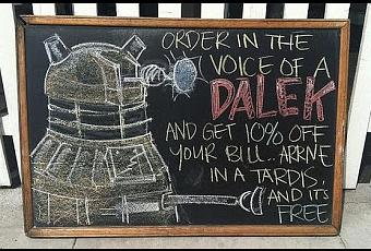 Si alguno tiene pensado visitar Burbank(California) en fechas cercanas y es tan fanático de Doctor Who como para saber imitar la voz de los Daleks,igual le interesa saber que esa habilidad tiene premio en un restaurante llamado Not a Burger Stand,situado en esa localidad norteamericana.Pedir el menú imitando el tono de voz de los despiadados Daleks hace que te cueste lo que pidas un 10% menos.Y si vas en una TARDIS,lo que pidas te sale gratis(Alguien tiene algún colega Señor del Tiempo?Se puede poner las botas).