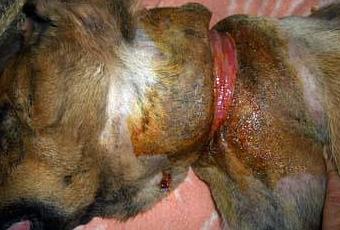 La perra fue recogida en Portovello por un vehículo de la Protectora, con una herida profunda en el cuello, producida, según explican desde la sociedad, por un cordón plastificado, que se supone que la mantenía presa. El collar se incrustaba en el cuello sobre unos tres centímetros, lo que le causó graves daños en la piel y en el tejido blando.