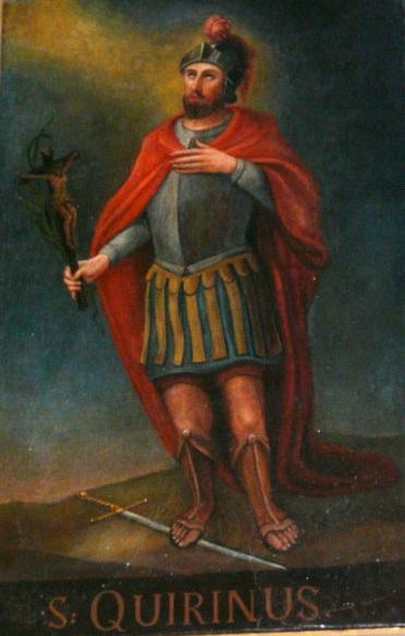 El culto de este santo se desarrolla en Alemania, tanto que ha perdido su coletilla "de Roma", para ser "de Neuss". El martirologio lo recoge a 30 de marzo, pero su más conocida memoria es a 30 de abril se recuerda su traslación, vestigio de su potente culto en Alemania, quedando relegada la memoria del 30 de marzo. Su leyenda, del siglo V, se incluye en la leyenda del culto a las Cadenas del apóstol San Pedro, recordada en la memoria de San Pedro Ad Víncula (1 de agosto). A partir de la "Leyenda Áurea" del Beato La Vorágine (13 de agosto) ganaría popularidad este santo. Se nos cuenta que, imperando Adriano, fue encarcelado el papa San Alejandro I (3 de mayo) y con él San Hermes (28 de agosto), prefecto de Roma, quien había sido convertido por Alejandro. Quirino, que era tribuno, habló a Hermes diciéndole: "Es curioso que un hombre sensato renuncie a todos los beneficios del cargo de prefecto para soñar con una vida tan diferente". Hermes le respondió: "Yo también creí un tiempo en todo terminaba con nuestra vida terrenal". Quirino le replicó: "¡Si me demuestras que hay otra vida, puedes hacerme tu discípulo!". Hermes le señaló al obispo Alejandro y le dijo: "Es mejor que preguntes a tu otro prisionero, porque él puede hacer eso mejor que yo". Pero Quirino le dijo amargamente: "te pido pruebas, ¿y me envías a Alejandro, que está preso como tú? Esto haré, les separaré en celdas distantes y les pondré doble guardia. Si vuelven a juntarse de algún modo, entonces estoy dispuesto a creer en lo que dices".
