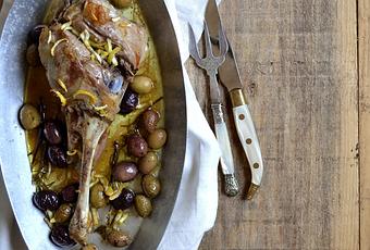 - le damos la vuelta a la pierna y bañamos un poco con el caldo de la cocción. Incorporamos las olivas y metemos al horno unos 40 min. Cuando comience a dorarse sacamos y cubrimos con la ralladura del limón, salpimentamos y dejamos hasta que estas comiencen a tostarse. Retiramos del horno y servimos.