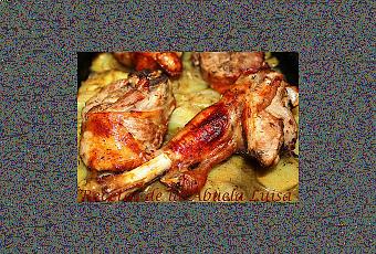 - Pedimos en la carnicería que nos partan la pierna en 4 trozos. - En un bol mezclamos el aceite, el vino blanco, el agua, los ajos picados, el tomillo, la pimienta y la sal (en la medida que lo podamos mezclar). - Untamos el fondo de la fuente de horno con un poco del aderezo anterior. - Pelamos y cortamos las patatas en rodajas de un dedo de gruesas, las ponemos en el fondo de la fuente. - Cortamos la cebolla en juliana gruesa, la colocamos por encima de las patatas. - Sobre la cama de patatas y cebolla disponemos los trozos de pierna. - Regamos todo bien con el aderezo. - Metemos la fuente en el horno precalentado a 200ºC unos 60- 80 minutos (el tiempo de horneado va a depender del tamaño de la pierna y del horno). - Vamos dándole vuelta a los trozos de carne cada 15-20 minutos y los rociamos con el jugo de la fuente, los dejamos hasta que estén bien dorados. - Si vemos que se va quedando seco podemos añadirle algo de agua.