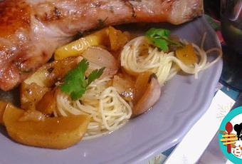 INGREDIENTESPARA 2 PERSONAS1 PIERNA DE PAVO1 MANZANA AMARILLA.30 GR DE JENGIBRE.50 GR DE JENGIBRE DESHIDRATADO.2 CEBOLLETAS.1 VASO DE BRANDY.SAL Y PIMIENTA.Y RAMILLETE DE CILANTRO.1 ZUMO DE LIMÓN.ACEITE DE OLIVA VIRGEN.100 GR DE ESPAGUETIS.50 GR. MIEL.