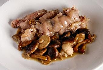 guarnición de setas variadas.Ingredientes para cuatro personas Cuatro pies de cerdo limpios 400 gr de setas variadas Un vaso de vino blanco Dos hojas de laurel Cuatro clavos de olor 1/2 cucharadita de cominos Sal Pimienta Aceite de oliva