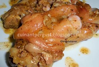 Ingredientes:Pies de cerdo cocidos (de venta en carnicerías y supermercados)2 cebollas picadas1 ½ cucharada de harina1 vaso de vino blanco2 hojas de laurelAjo picadoPerejil picadoPimentón dulce1 pastilla de caldo vegetalGuindilla (opcional)Aceite de olivaSal