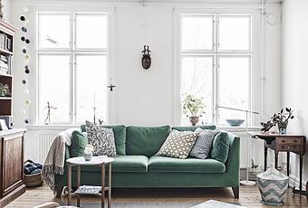De esta vivienda me encanta tanto su exterior como el interior, tras un exterior con una arquitectura de lo más pintoresca, con fachadas de colores e incluso una guitarra colgada bajo una de las ventanas, se esconde un interior lleno de paz y calma, en el que las paredes blancas hacen de lienzo a preciosos muebles vintage de madera y en el que, el sofá verde hace un contraste perfecto en el salón.