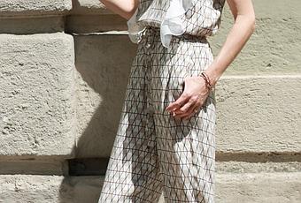 Buenos días! Ya os enseñé hara un par de meses o tres un total look pijama en tonos azul marino y rayas. El de hoy es mas primaveral, en tonos claros, con tirantes y un cuello en pico negro que me encanta! Que os parece? Y como os gusta mas con el top por dentro y dejando ver la cintura en talle alto o por fuera? El toque: los volantes (otro must have) que caen del top.