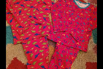 El tejido del segundo pijama tambien es de punto elastico tipo camiseta , el fondo tambien es de color rojo pero el estampado es diferente este lleva dibujo de dinosaurios de diferentes colores.