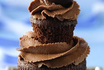 Para montar la pila de cupcake, retirar los moldes de papel de todos los cupcakes. Coloque un rosetón de frosting encima de un cupcake normal. Ponga un mini cupcake encima del frosting, poner otro rosetón de frosting encima del mini cupcake. Repita con el resto de los cupcakes. Decorar con rizos de chocolate y coco, si lo desea.