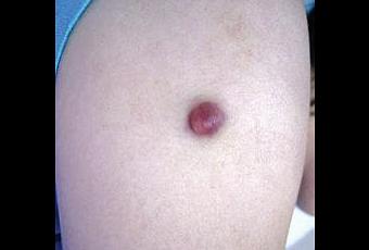 Reporte de un casa:Consulta una niña de 16 años con un nódulo solitario, firme debajo de la piel del brazo derecho de 2 meses de evolución. Se agrandó con el tiempo, y la apariencia ampollar se detectó hace 1 mes. No se reportó trauma local ni historia familiar de lesiones similares. El exámen dermatológico reveló una ampolla de 1cm, de paredes gruesas, color rosa en la parte extensora del brazo derecho (fig 1)