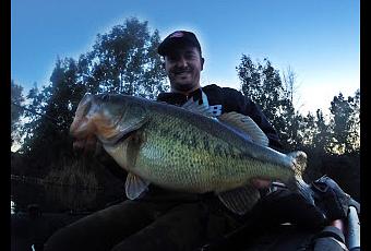 Ya justo antes de salir, entre que decides cual va a ser tu último lance por resignación al "bolo", noto una pequeña retención en mi swimbait, creí que se trataba de un junco ya que había perdido toda esperanza, pero clavé por si acaso. La caña se quedo doblada como si hubiese enganchado una rama, cuando de repente noto que algo se pega una carrera hacia mi, pasandome por debajo. Conseguí frenar su carrera y traerlo con la boca abierta hacia la superficie lo suficientemente cerca que lo pude coger, mas bien parecía que se había dejado coger. Al levantarlo y notar el peso me temblaba todo.