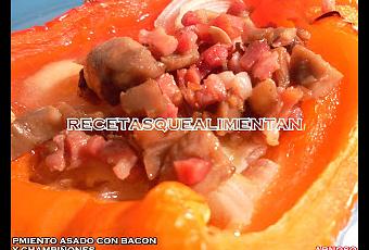 INGREDIENTES2 pimientos rojos, 100 gr. de champiñones, 100 gr. de queso semicurado, 100 gr. de bacon (o jamón serrano) en dados, una cebolla, 2 dientes de ajo, perejil picado, aceite de oliva, sal.PREPARACIÓNLavamos los pimientos y los cortamos por la mitad a lo largo, retiramos las pepitas del interior. Ponemos las 4 mitades de pimiento en una bandeja o fuente de horno y dentro de los pimientos una base de aros de cebolla, un chorrito de aceite de oliva, sazonamos e incorporamos también un trozo de queso semicurado a cada mitad de pimiento. Horneamos en el horno previamente calentado a 180º durante 35 minutos aproximadamente. Retiramos del horno y preparamos los Pimientos Asados con Bacon y Champiñones rellenando con un par de cucharadas del sofrito de champiñones. Salud.