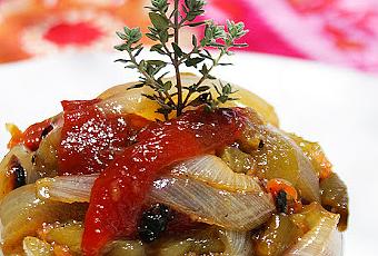 De repente observé que tenía el cajón de la nevera lleno de pimientos y pregunté a mi churri "¿Quieres comer hoy pimientos asados?" Y eso hice, coloqué en la bandeja de horno un pimiento rojo, otro verde, una cebolla picada por la mitad, sal, pimienta y un chorro de aceite de oliva y al horno fuerte hasta que la piel de los pimientos casi que se quemara y tomase un aspecto arrugado, señal que la piel se ha despegado de la carne del pimiento. Retiré del horno y esperé que enfriara para luego retirar con mucha facilidad la piel de los pimientos. Corté todo en juliana y por último rallé hasta formar una pasta dos dientes de ajo y en un bol mezclar todo con un chorrito de aceite de oliva. Como guinda un ramillete de tomillo de mi jardín. Fácil, rápido y perfecto como acompañante.