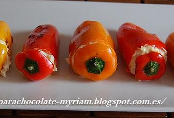 Ahora con una cucharita de postre rellenaremos los pimientos y le pondremos luego la tapa que habíamos quitado al principio. Servir en una fuente alargada.Y ya están estos sencillos y nutritivos pimientos listos para comer ahora que se supone que tendría que hacer calor.Espero que os animéis a hacerlos y me contéis que rellenos habéis puesto.