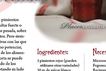 Asar:Se lavan los pimientos, se secan y se colocan enteros en el recipiente de cristal > Los introducimos en el microondas a máxima potencia durante 10 minutos. Al terminar, daremos la vuelta a los pimientos e introduciremos de nuevo durante otros 10 minutos. Si vemos que los pimientos aún están muy duros, en lugar de blandos, con la piel algo despegada de la carne, podemos volver a darles una vuelta durante 5 minutos más (pueden asarse al horno, en una bandeja a 170oC durante 40 minutos) > Una vez asados, dejamos enfriar con la tapa puesta durante 15-20 minutos > Para pelarlos, retiramos la piel con cuidad de no romper la carne demasiado, es inevitable que se rasgue a veces. Quitamos con especial atención todas las pepitas, pues luego pueden amargar el sabor > Tras pelarlos, se cortan, con las manos, tiras de un dedo de ancho más o menos y se reservan.