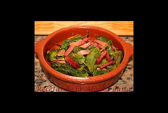 - Lavamos los pimientos y los dejamos secar bien. - Los freímos con un poco de sal (no mucha porque luego pondremos el jamón) en abundante aceite a fuego lento (para que no se quemen ya que tienen la piel finita), cuando estén casi hechos añadimos el jamón cortado en tiras. - Sacamos con una rasera para que no tenga mucho aceite. - Y cuidadín al comer que los que pican, pican a base de bien…