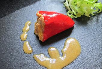 Estos pimientos, junto con otros aperitivos, los he cocinado esta Navidad pasada en uno de nuestros encuentros familiares. Como me han pedido que muestre algunas de las cosas que he puesto, no he tenido inconveniente en hacerlo, pero como no tenía intención de publicarlos no tengo las fotos del paso a paso. Voy a intentar suplirlo con una explicación detallada para que no se os escape nada ¡lo bueno es que sí tengo fotos de los emplatados! . Así que aquí tenéis uno de ellos. Realmente deliciosos.