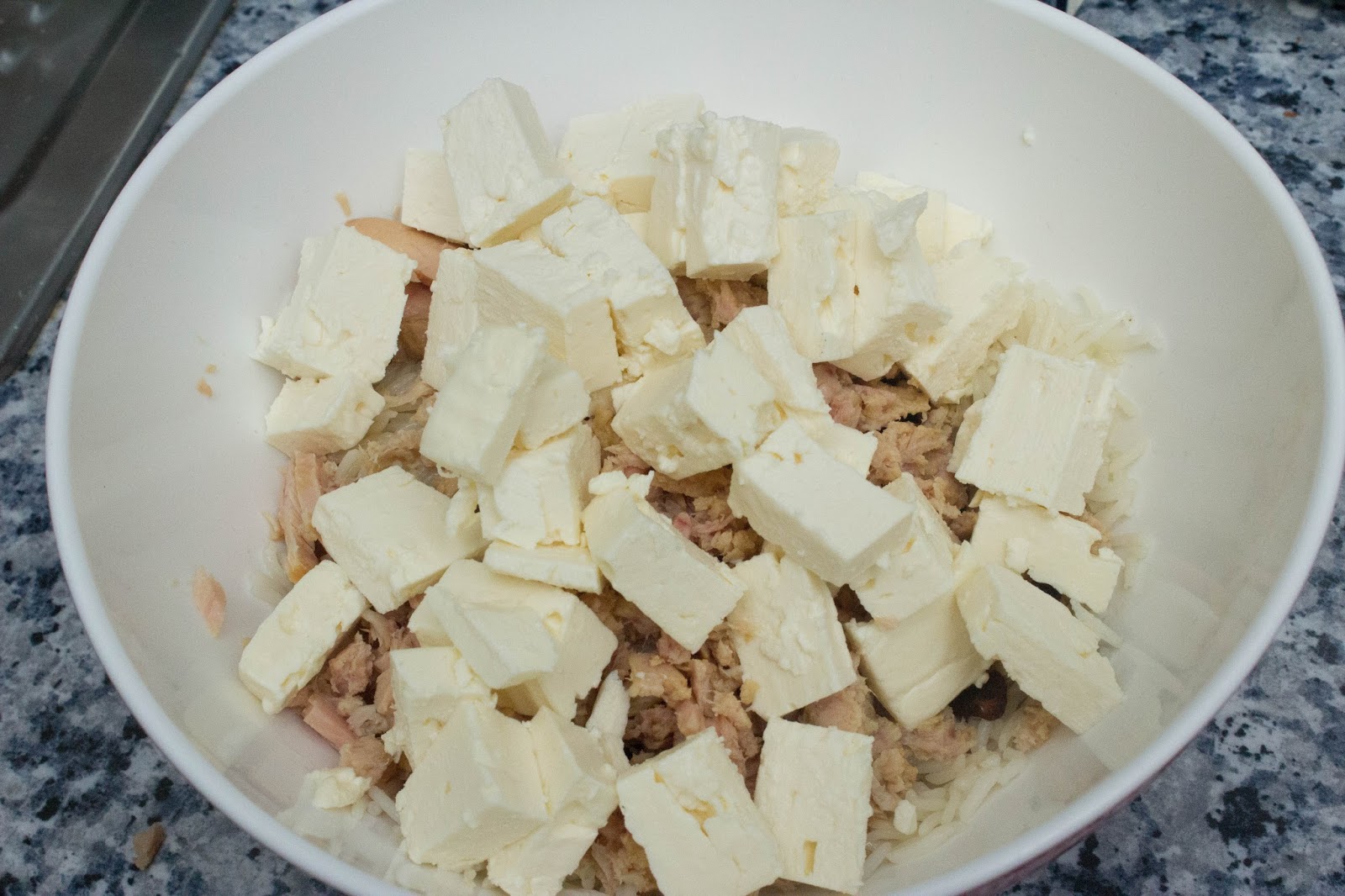 Cortar el queso feta en trocitos y remover de nuevo. Calentar el horno a 180º.