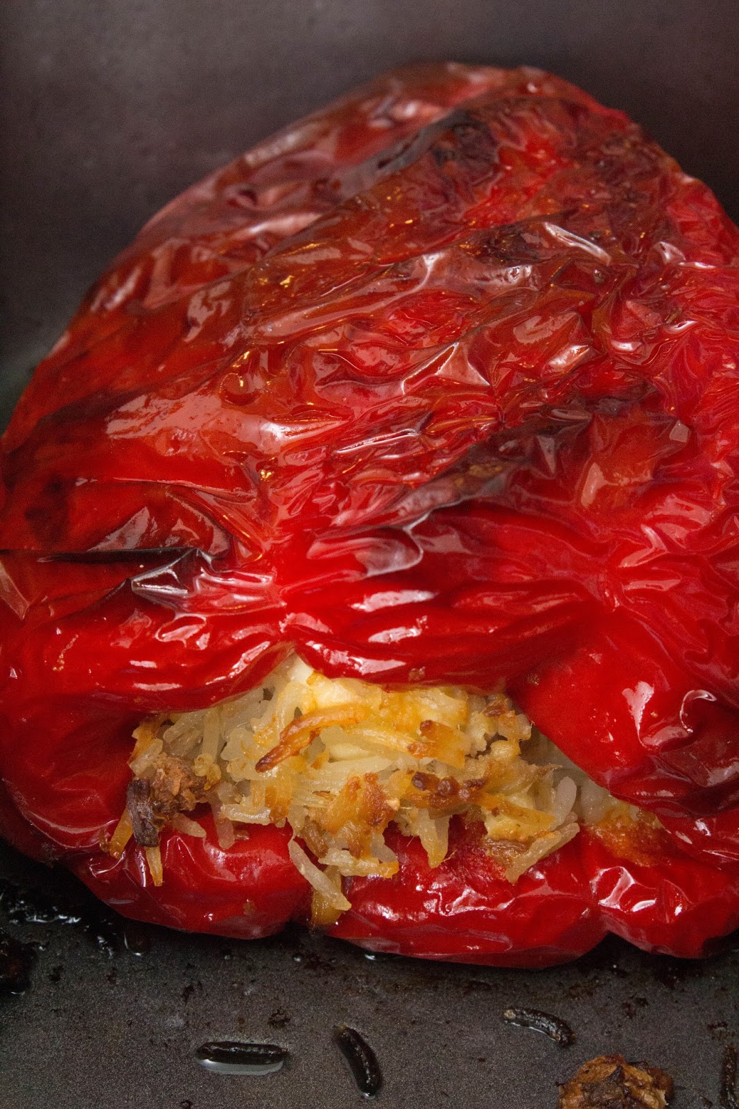 Mételo al horno con un chorro de aceite por encima y lo dejas unos 50 minutos hasta que esté bien hecho el pimiento.