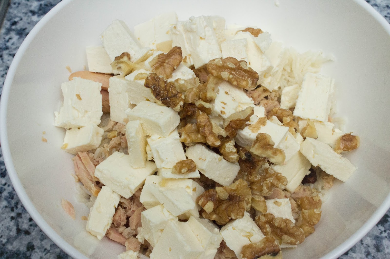 Ingredientes:3 pimientos grandes para asar rojos2 bricks de arroz blanco pasas1 queso feta2 latas de atún12 nueces