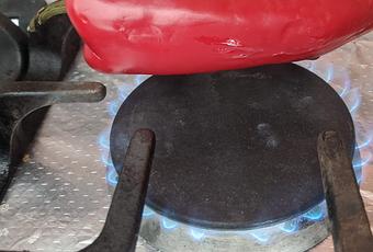 1) Ponemos a quemar nuestros pimientos morrones en la llama de fuego de nuestras hornillas.