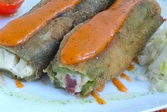 - Freír en aceite 4 pimientos italianos verdes, cortando el tallo y retirando las semillas. Cuando estén fritos, retirar y dejar enfriar ligeramente. Abrir por un lado a lo largo, rellenar con la bechamel y enrollarlos con cuidado, que queden bien cerrados. Pasar por harina, huevo batido y pan rallado, freír en abundante aceite caliente y escurrir sobre papel absorbente.