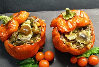 Cuando el arroz este cocido y quede más bien seco pero cremoso, agregar el sofrito de verduras las setas y volver a saltear todo con 1 cucharadita de mantequilla para hacerlo más cremoso. Rellenar con cuidado los pimientos. Servir seguidamente.